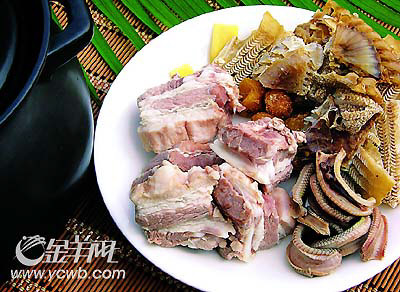 原料:彭魚(yú)鰓干、蛇干、脊骨、赤肉、蜜棗、姜片、陳皮、鹽、雞粉。