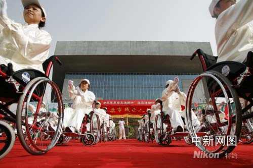 三十輛輪椅來到人群中,三十六位當?shù)貧埣踩藥淼囊欢翁珮O拳表演給人們帶來別有情韻的意境:迎接奧運,挑戰(zhàn)自我,與奧運同行,生命在陽光下依然多姿多彩。由衷的喝彩聲已經在人群中響起來。