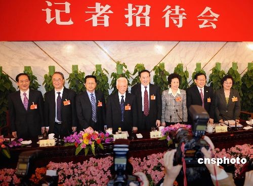 三月六日下午,全國政協(xié)十一屆一次會議記者招待會在北京人民大會堂新聞發(fā)布廳舉行,主題是“民主黨派中央主席談多黨合作”。九三學社中央主席韓啟德、農工黨中央主席桑國衛(wèi)、民建中央主席陳昌智、民革中央主席周鐵農、民盟中央主席蔣樹聲、民進中央主席嚴雋琪、致公黨中央主席萬鋼、臺盟中央主席林文漪(從左至右)共同亮相,受到中外媒體的熱烈關注。中新社發(fā) 廖攀 攝