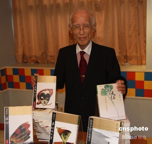 為祝賀詩人余光中八十大壽,臺(tái)灣九歌出版社特意出版余光中最新詩集《藕神》、近十年的文學(xué)評論精選《舉杯向天笑》、翻譯英國名作家王爾德的劇本《不要緊的女人》等五本書,展現(xiàn)他在文學(xué)路上的成就。十月二日,臺(tái)灣藝文界提前為他祝壽,余先生在五本新書前留影。中新社發(fā) 耿軍 攝