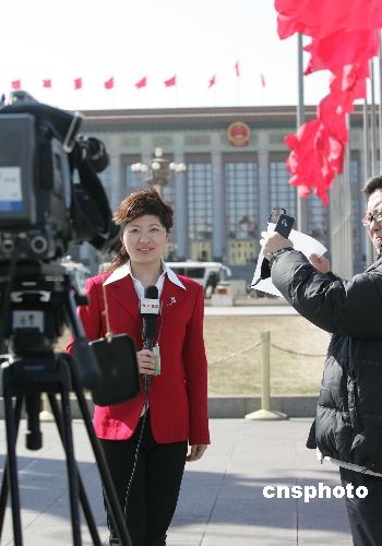 三月三日下午,全國政協(xié)十一屆一次會議在北京人民大會堂開幕,地方電視媒體記者盛裝進(jìn)行現(xiàn)場報道,關(guān)注大會議程。中新社發(fā) 毛建軍 攝