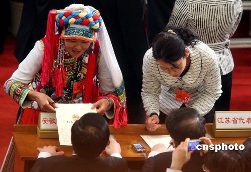 3月17日下午,十一屆全國人大一次會議在北京人民大會堂舉行第七次全體會議,決定國務院副總理、國務委員、各部部長、各委員會主任、中國人民銀行行長、審計署審計長及國務院秘書長人選;表決全國人大各委員會主任委員、副主任委員、委員名單草案。在投票表決間隙,一些全國人大代表抓緊時機在各代表團坐席請省領(lǐng)導簽名留念。 中新社發(fā) 張宇 攝