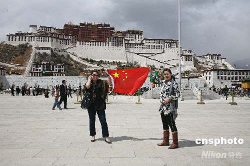 圖:游客布達(dá)拉宮前展國(guó)旗支持奧運(yùn)