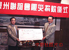 得知故鄉(xiāng)海南發(fā)生特大水災(zāi),“澳門瓊州聯(lián)誼會”會長歐國梁(左)一行八人,23日專程趕到海南捐款十萬元人民幣。這是海南發(fā)生災(zāi)情后第一個向海南捐款的海外社團(tuán)。海南省副省長韓致中(右)代表災(zāi)區(qū)人民接受捐款。中新社記者 關(guān)向東 攝