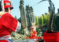 春天到云南石林旅游的游客,穿上彝族服裝在阿詩瑪形象石前拍攝美好的瞬間。中新社記者 滿會(huì)喬 攝