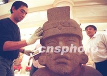 墨西哥專家(左)三十日在北京中華世紀(jì)壇內(nèi)安裝瑪雅文物“王子”。包括186件瑪雅珍品的“神秘的瑪雅”--墨西哥文明展將于六月二日向觀眾開放。中新社圖 鄭萍萍 攝