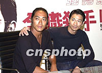 電影《全職殺手》兩位男主角劉德華反町隆史2日在香港與傳媒會(huì)面,劉德華搭著反町的膊頭,感謝他專程由日本抵港為影片宣傳造勢(shì)。中新社圖 鄧慶樂(lè) 攝