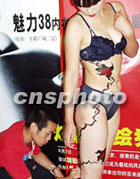 圖:“魅力38內(nèi)衣”人體彩繪 2001年08月03日 17:50 ![]() 北京“魅力38內(nèi)衣”,三日在北京豐聯(lián)廣場開設(shè)京城第二家分店,一名畫師聚由海外公司合作開辦的北京“魅力38內(nèi)衣”,三日在北京豐聯(lián)廣場開設(shè)第二家分店。圖為一名畫師正聚精會(huì)神為身穿內(nèi)衣的模特小姐繪畫。中新社記者 錢興強(qiáng) 攝