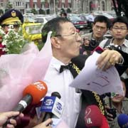 圖文:一討債公司老板向呂秀蓮求婚遭警方攔下 2001年12月11日 13:51 ![]() 呂秀蓮(資料圖片) ![]() 董念臺11日捧著99朵紅玫瑰,率領(lǐng)48輛豪華禮車,浩浩蕩蕩去向心儀許久的呂秀蓮求婚,但遭警方攔下。董念臺說不能阻止他求婚的意志。(張良一攝) 中新網(wǎng)香港12月11日消息:臺北訊,臺灣一討債公司負(fù)責(zé)人董念臺今天上午演出向呂秀蓮“求婚記”,不過求婚車隊在途中即遭到臺北市警察局?jǐn)r下,董念臺在不滿下憤而離去。 據(jù)“中央社”報道,對于今天的求婚之舉,董念臺稱,他欣賞呂秀蓮憨直、有話直說的個性,他認(rèn)為呂是位優(yōu)秀的女性。 上午九時許,由十二輛奔馳、十二輛卡迪拉克高級轎車組成的車隊從臺北市中正紀(jì)念堂出發(fā),浩浩蕩蕩準(zhǔn)備到“總統(tǒng)府”“求婚”。 車隊在抵達(dá)“總統(tǒng)府”前的貴陽路遭轄區(qū)員警攔下,董念臺穿著燕尾服,手上拿著九十九朵玫瑰和一封求婚信件,他不滿指出,他與呂秀蓮男女未婚,答應(yīng)求婚與否固然是女方的權(quán)利,但求婚也是他的自由,這是人民應(yīng)有的民主法治。 董念臺說,如果說他妨礙交通,事前他已去函臺北市警局,但警方并未制止,現(xiàn)在又說他違反“集會游行法”,他認(rèn)為是警方違法在先。 稍后,董念臺認(rèn)為既然高攀不起,憤而將玫瑰花扔在地上后離去。 相關(guān)報道:真情?搞笑?臺灣一討債公司老板向呂秀蓮求婚 |