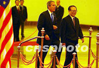 中新社北京二月二十一日電 題:江澤民主席主持儀式歡迎布什總統(tǒng) 中新社記者 朱大強(qiáng) 早春二月,美國(guó)總統(tǒng)喬治·沃克·布什來(lái)到北京,來(lái)到人民大會(huì)堂,受到中國(guó)國(guó)家主席江澤民的熱烈歡迎。 今天的大會(huì)堂北大廳,地上鋪著紅地毯,莊嚴(yán)的五星紅旗和星條旗分別豎立在檢閱臺(tái)兩側(cè),威武的三軍儀仗隊(duì)正面排列、記者們的攝像和攝影鏡頭調(diào)準(zhǔn)焦距…… 上午十一時(shí),江澤民和夫人王冶坪在大會(huì)堂北大廳門口歡迎布什和夫人勞拉。兩國(guó)元首熱烈握手,這是自去年十月他們?cè)谏虾?huì)晤四個(gè)月后首次在北京見(jiàn)面。 布什總統(tǒng)身著深色西裝,系著蘭色領(lǐng)帶,春風(fēng)得意。 在相互介紹雙方參加歡迎儀式主要官員后,江澤民主席與布什總統(tǒng)走上檢閱臺(tái)本國(guó)國(guó)旗一側(cè),江澤民主席夫人王冶坪和布什總統(tǒng)夫人勞拉站立其后。軍樂(lè)隊(duì)奏響美國(guó)國(guó)歌和中國(guó)國(guó)歌。之后,布什總統(tǒng)在江澤民主席的陪同下,檢閱儀仗隊(duì),當(dāng)走到中國(guó)人民解放軍軍旗前時(shí),布什立正向軍旗行注目禮。 訪問(wèn)北京是布什時(shí)隔二十多年后故地重游。上個(gè)世紀(jì)七十年代中期,布什的父親老布什出使中國(guó)時(shí),他曾來(lái)北京探望過(guò)父母。所以,布什對(duì)北京并不生疏,所不同的是北京的發(fā)展太快了。 更有新意的是今天巧為尼克松總統(tǒng)三十年前訪華紀(jì)念日,作為第五十四屆美國(guó)總統(tǒng),布什踏著尼克松、老布什的足跡訪問(wèn)中國(guó),使命重大。布什說(shuō):中國(guó)是一個(gè)偉大的國(guó)家,美國(guó)必須努力與中國(guó)發(fā)展良好、真誠(chéng)的關(guān)系。 這是一個(gè)重要契機(jī),此次江澤民主席與布什總統(tǒng)的會(huì)晤,將明確宣示中美兩國(guó)保持和擴(kuò)大的合作領(lǐng)域,取得多方面的積極成果。 十分鐘的歡迎儀式結(jié)束了。在軍樂(lè)聲中,踏著中國(guó)的紅地毯,江澤民主席與布什總統(tǒng)像老朋友一樣,邊走邊交談著,走向會(huì)談廳。