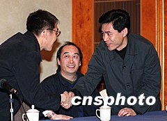 ![]() 二十集電視連續(xù)劇《公安局長》四月中旬即將開拍,該劇由田迪執(zhí)導。圖為著名作家海巖(左)向男主角陳寶國(右)祝賀。該劇由公安部、中國新聞社、四川有線電視臺以及誠成影聯(lián)影視策劃聯(lián)合攝制,將于今年秋季播出。中新社記者 張宇 攝