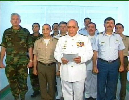 ![]() 當(dāng)?shù)貢r間4月11日,委內(nèi)瑞拉海軍參謀長拉米雷茲-佩雷斯(前方著白衣者)代表30名軍官通過錄像帶宣布,不承認(rèn)查韋斯總統(tǒng)。