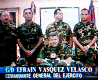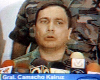 多圖:委內(nèi)瑞拉高級將領(lǐng)發(fā)表電視講話加入叛軍 2002年04月12日 12:22 ![]() 委內(nèi)瑞拉當(dāng)?shù)貢r間4月11日晚(北京時間12日上午),國民警衛(wèi)隊的卡伊魯茲將軍宣布,總統(tǒng)查韋斯的政府已經(jīng)"不再履行其職能",全國局勢已經(jīng)被軍隊控制。此前已有多名高級軍官宣布不承認(rèn)總統(tǒng)查韋斯,并要求其下臺。圖為委內(nèi)瑞拉軍隊司(中).(春風(fēng))