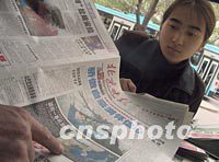 圖:北京市民關(guān)注國(guó)航客機(jī)墜機(jī)事件 2002年04月15日 16:50 ![]() 一位北京市民十五日下午正在街頭報(bào)亭購(gòu)買當(dāng)日晚報(bào),了解中國(guó)國(guó)際航空公司一架波音767客機(jī)在韓國(guó)釜山機(jī)場(chǎng)附近墜毀的相關(guān)消息。中新社記者 張勤 攝