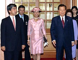 圖:日本天皇的弟弟拜訪韓國總統(tǒng)金大中 2002年05月30日 17:04 ![]() 5月30日在漢城,出席日韓世界杯開幕式的日本天皇的弟弟高元宮偕夫人拜訪韓國總統(tǒng)金大中。共同社圖