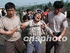 目擊:白山市江源縣“七·四”礦難大救援側(cè)記 2002年07月05日 16:03 ![]() 三十九名礦工被困井下生死不明,其家屬聞訊后悲痛欲絕。目前搶救工作正在緊張進行中。吳兆飛 攝 中新社白山七月五日電題:為了井下三十九名礦工兄弟 ——白山市江源縣“七·四”礦難大救援側(cè)記 作者 吳兆飛 祝子眾 程澤 記者趕到白山市江源“七·四”煤礦瓦斯爆炸事故現(xiàn)場已過中午,距事故發(fā)生已十幾小時,現(xiàn)場目睹了“七·四”礦難的緊張有序的救援工作。 發(fā)生事故的富強煤礦從一九九六年開始采煤。二OOO年三月四日中午十二時三十分,隨著瓦斯爆炸的轟隆巨響,二十一名礦工永遠告別了這個世界。而今天,又有三十九條生命在這里懸于一線。 富強煤礦東側(cè)有一個大煤堆,上面有纜繩、礦車等設(shè)備。主井坐落在煤礦兩側(cè),這里聚集著四十多名礦工,正在緊急救援。在主井旁邊,記者看到四十多名工人分成三組:一組集中在塌方的坑道里,正在向外轉(zhuǎn)移塌下來的泥土、石塊、支柱和橫梁;一組聚集在坑道一側(cè),將扔上來的泥沙運走;一組分散在四周,用礦車向外搬運塌方的泥石、木材等。 記者在現(xiàn)場看到悲痛萬分的礦工陳在先,他的二哥在此次礦難中被埋在下面。據(jù)陳介紹,他們來自四川簡陽農(nóng)村,是他鼓動二哥一起到這里賺錢,本想有個照應(yīng),沒想到發(fā)生了礦難。他聽到爆炸聲,拼命從住處跑到發(fā)生礦難的井口,當(dāng)時井口還冒著煙。他邊流淚邊拼命地用手挖土,向外搬石塊!爱(dāng)時我沒有感到一點疼痛!辈痪么蠹叶稼s來救援。 在井口,記者看到救援人員的臉被煤灰染黑。因為天氣悶熱,很快汗水成泥淌了下來,不時迷住雙眼,他們就用袖子擦一下,繼續(xù)揮鍬清理……據(jù)一位剛換下來的救援礦工說,“我們礦工在一起很長時間了。一日不見,他們就被埋在地下,那可是三十多個兄弟呀!我們不管付出多大代價也要把他們找到。” 據(jù)悉,事故發(fā)生后,造成主井口部位十多米的泥石塌方,將井口覆蓋,要想救援,先要清除這里的塌方物。主井東側(cè)還有一個副井,此時風(fēng)扇已經(jīng)打開,緊急向外排放瓦斯氣體,坑道有三百多米長,救援的工作人員從副井進去以后,走了大約五十延長米,發(fā)現(xiàn)前方塌方嚴重,再進入很可能發(fā)生不測,于是撤出來商量救援對策。 與井口挖掘搶險工作同時進行的副井口疏通排氣工作也在緊張進行,緊急排放瓦斯爆炸后產(chǎn)生的有毒氣體,并有可能在此井口實施搶救。當(dāng)記者離開現(xiàn)場時,副井口周圍由于排出的有害氣體的積聚,為了安全,現(xiàn)場已開始疏散除搶救人員以外的工作人員,并嚴禁攝像、拍照、打手機等一切可誘發(fā)再次爆炸的不安全舉動。 事故發(fā)生后,吉林省副省長李介車帶領(lǐng)白山市、江源縣有關(guān)官員迅速趕赴現(xiàn)場,下到坑道里進行巡視,征求有關(guān)專家意見后擬定了初步搶險方案 目前,事故搶險工作正在緊張有序地進行,礦區(qū)社會狀況平穩(wěn)。(完)