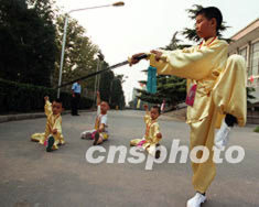 幾位湖北少年在秋日的陽光下集體練劍術(shù)修武功。熒屏武打片的盛行和許多父母希望自己的獨生子女少點任性軟弱、多點陽剛等原因,致使中國各地練武的少年越來越多。作者:王麗南