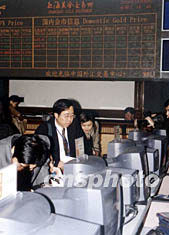 上海黃金交易所三十日正式開業(yè),標志著中國長達半個世紀的黃金管制徹底結束,亦表明中國由貨幣市場、證券市場、保險市場、外匯市場和黃金市場所組成的主要金融產品交易市場全部建成。圖為上海黃金交易所交易大廳。作者:姜煜