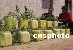 沂蒙山區(qū)費(fèi)縣大田鄉(xiāng)黃土莊村青年農(nóng)民田榮芳是當(dāng)?shù)剡h(yuǎn)近聞名的“沂蒙山西瓜王”,在十六大召開前他經(jīng)過反復(fù)試驗(yàn),終于培育出了長(zhǎng)有“熱烈慶祝中國(guó)共產(chǎn)黨十六大勝利召開”字樣的16個(gè)正方形西瓜,每個(gè)重約16斤左右。代表了沂蒙老區(qū)農(nóng)民心向黨中央的、盼望著黨的十六大早日召開熱切心情。田榮芳高興地說:“俺正準(zhǔn)備把西瓜運(yùn)往北京,獻(xiàn)給黨中央、獻(xiàn)給十六大!”王樹芳、潘振宇 攝