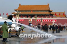 清潔工人四日用高壓水車(chē)沖刷北京天安門(mén)廣場(chǎng),創(chuàng)造優(yōu)良環(huán)境,迎接即將召開(kāi)的中國(guó)共產(chǎn)黨第十六次全國(guó)代表大會(huì)。作者:毛建軍