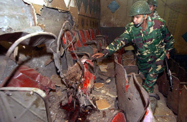 孟加拉國邁門辛市7日傍晚發(fā)生影院爆炸案后,8日又有4名傷者因搶救無效死亡,從而使死亡人數由14人上升到18人。7日傍晚,位于首都達卡以北127公里的邁門辛市4家影院先后發(fā)生炸彈爆炸,當場炸死14人,100多人受傷。受傷者被立即送往醫(yī)院緊急搶救,其中不少人傷勢嚴重。圖為警察在檢查爆炸地點。