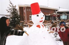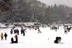 上午11點,陶然亭公園潔白的湖面成了公園人氣最旺的地方。人們在冰面上滾雪球、堆雪人、打雪仗、滑冰車。走在公園的小路上,你會跟許多形狀滑稽的雪人不期而遇,它們相貌各異,有的頭插一串鮮花,有的脖子系著五彩繽紛的布條,有的頭頂一片綠色柏樹枝。一群中學生玩雪的創(chuàng)意更是獨特:將數十個拳頭大的雪球串在一棵桃樹的樹枝上,遠遠望去,仿佛滿樹盛開著鮮花。