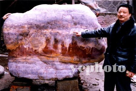 李發(fā)軍見石頭上有青紫、紫紅、灰黑、乳白、米黃等5種色彩,石面中下部有一帶紫紅色山峰,峰下是一帶米黃色水浪,上部是遠(yuǎn)山和浮云,整個(gè)畫面酷似一幅長(zhǎng)江三峽夔門風(fēng)雨群峰圖。