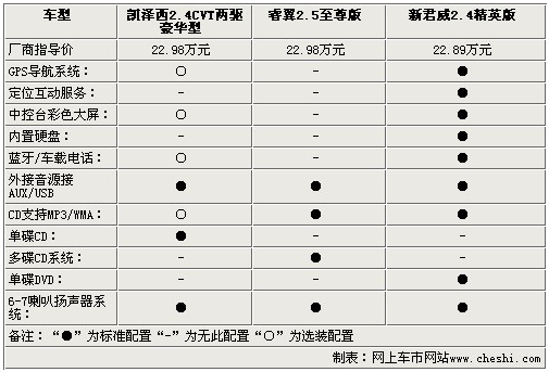 影音系統(tǒng)方面,三款車都為使用者提供了多揚聲器的配置,除了AUX/USB接口外,凱澤西還配備了單碟CD,而睿翼則配備了更為便利的6碟CD系統(tǒng),新君威為單碟DVD。通過以上參數(shù)配置方面的比較,對于三款22.98萬左右的中級車,配置方面基本打成平手,僅在一些細(xì)節(jié)方面有所出入,不過動力方面凱澤西確是實實在在的戰(zhàn)勝了睿翼和新君威,幾乎將2.4L引擎的動力發(fā)揮到了極致。