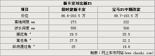 但是保時(shí)捷為卡宴標(biāo)配的空氣懸架系統(tǒng)因其能夠?qū)崿F(xiàn)車輛離地間隙的提升,因而在最大離地間隙、涉水深度以及接近角離去角的部分非常出色,相比BMW的X5來說這部分的優(yōu)勢(shì)在一些惡略路況下就會(huì)顯得非常明顯了。