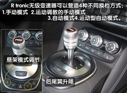 作為這臺發(fā)動機的動力輸出,奧迪R8可以選配“R tronic無級變速器”,或手動6速變速器,不過試駕的車輛均為R tronic無級變速器。這臺R tronic無級變速器的優(yōu)勢在于可以營造4中不同的換檔方式即:1.純手動模式2.運動調(diào)教的手動模式3.純自動模式4.運動型自動模式。利用變速器的模仿依然能夠在手動狀態(tài)下提供6個前進檔位的傳動比。