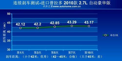 加速偏弱或許對(duì)一些人來(lái)說(shuō)不是問(wèn)題,而剎車(chē)無(wú)論如何都不能含糊。這一點(diǎn)上普拉多的表現(xiàn)得很稱(chēng)職。盡管由于車(chē)身較高,剎車(chē)姿態(tài)看起來(lái)有些令人不安,但從100公里/小時(shí)剎車(chē)到靜止只需要42.85米,而且剎車(chē)一直穩(wěn)定在43米左右,已經(jīng)算是非常不錯(cuò)的成績(jī)。