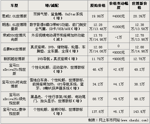 不同品牌共推出9款世博版車型,范圍從自主到進口,從緊湊級到頂級豪華車,體現(xiàn)出世博這一世界人類盛會的巨大影響力。車型全部采用增加或較少配置的做法進行改款,最高價格漲幅達到了9.5萬,降價車型只有一款,降幅為1萬。