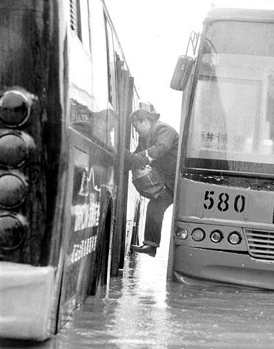7月13日,網(wǎng)友復(fù)古魚在得意網(wǎng)發(fā)出了名為《在武漢不會(huì)開飛機(jī)的船長不是好司機(jī)》的帖子,其中附上了三張圖從不同角度反映了公交車司機(jī)“瘋狂”的一面,第一張圖中一輛公交車飛馳而過,前輪離地約30厘米,網(wǎng)友看后驚呼“果然飛起來了!”;第二張圖中公交車如同船一樣趟深水而過,大量水花濺離地面約2、3米;第三張更是“雷”人,一約六旬太婆被夾在兩公交車間正在痛苦的“跳車”,而她身下則是已沒過車輪胎的深水。