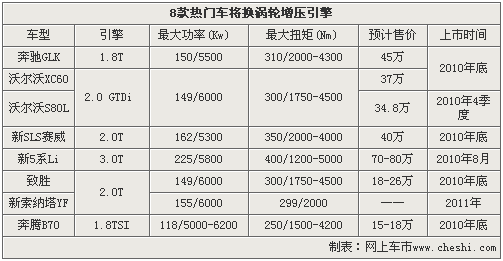 奔馳GLK和沃爾沃XC60作為原裝進口車型,將于今年年底左右分別引入搭載1.8和2.0排量的渦輪增壓引擎的車型。而作為國產合資車型的新5系Li、沃爾沃S80L、新SLS賽威、致勝、新索納塔等車型,也將紛紛推出各自排量的渦輪增壓車型。除此之外,作為自主品牌代表的一汽奔騰B70,也將推出搭載大眾1.8TSI渦輪增壓燃油直噴引擎的車型。