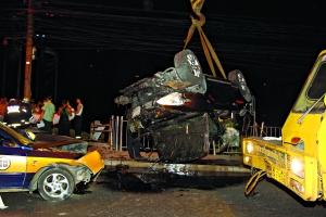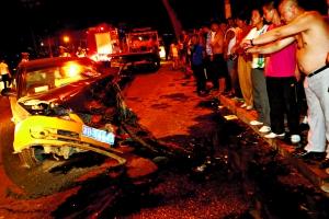 “有‘嗡嗡’的馬達聲,只看到一道黑影閃過!蹦繐粽叩耘空f,當(dāng)時酒仙橋路上一輛黑色轎車由南向北疾速行駛,“咣”地一聲悶響,迎面將一輛羚羊轎車撞得原地打轉(zhuǎn),隨后繼續(xù)前行。緊接著,不遠處再次傳來碰撞聲,一輛逆向車道上的出租車“被黑轎車頂回去三四米”。黑轎車隨即變向,撞壞橋邊護欄墜河。