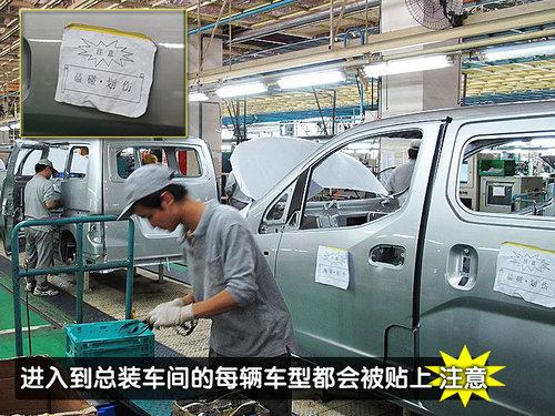 進入鄭州日產(chǎn)生產(chǎn)車間前,工作人員要求我們把戒指、手表等利器全部摘掉,以免在參觀時刮傷車漆。車間里的每輛車的車身都被貼上注意 磕碰 劃傷的貼紙,更加明顯的提醒了工作人員工作時要小心。
