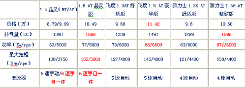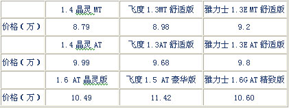 上表列出了晶靈版晶銳、飛度和雅力士三款車型的售價(jià),從中我們可以發(fā)現(xiàn):首先,在手動(dòng)車型方面,晶靈版1.4MT車型的售價(jià)僅為8.79萬,比雅力士和飛度都要低;其次,晶靈版晶銳1.4AT在價(jià)格上看似要比競(jìng)品的1.3L AT車型稍高,但考慮到晶銳采用的是Tiptronic6擋手自一體變速箱,而飛度和雅力士都是四檔自動(dòng),落后不止一點(diǎn),加上晶銳的配置要豐富很多,這點(diǎn)在后文會(huì)有詳細(xì)介紹,綜合來看晶銳1.4AT晶靈版的性價(jià)比優(yōu)勢(shì)還是相當(dāng)突出的。另外,晶銳1.6L AT晶靈版,無論是品質(zhì)上,還是配置上都擁有同級(jí)競(jìng)品車型所無可比擬的優(yōu)勢(shì),而其價(jià)格卻要大大低于這些競(jìng)品。