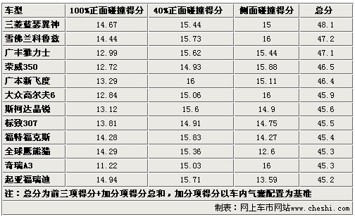 通過(guò)以上表格,我們可以看出這樣一個(gè)現(xiàn)象,12款車(chē)當(dāng)中涉及自主品牌、日韓系列和德美系列各國(guó)車(chē)型。很多人一直堅(jiān)信德美系的車(chē)要比其他兩類(lèi)車(chē)要結(jié)實(shí),但事實(shí)證明他們的成績(jī)也并非那么無(wú)懈可擊?磥(lái)C-NCAP的鐵證也可以做一回流言終結(jié)者了,不過(guò)這12款車(chē)全部達(dá)到了45分以上,也就是C=NCAP五星級(jí)安全標(biāo)準(zhǔn)。至于傳說(shuō)中的五星半級(jí)別,在比較常見(jiàn)的國(guó)產(chǎn)車(chē)中只有雅閣和CR-V達(dá)到。