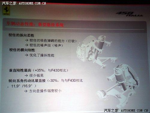 該車采用的新型底盤亦為鋁制,在底盤設(shè)計(jì)過程中,馬拉內(nèi)羅的工程師不僅運(yùn)用了各類先進(jìn)的合金材料,同時也從航空航天業(yè)借鑒了尖端的制造和焊接技術(shù)。在車輛動力方面,法拉利458 Italia的懸掛系統(tǒng)在前部配備了雙叉骨,而后部則采用了多鏈系統(tǒng),借以提供最大的附著力和無與倫比的操控性能。該車的轉(zhuǎn)向傳動比更加快捷高效,在實(shí)現(xiàn)極速入彎的同時也能保證超凡的駕駛舒適度。