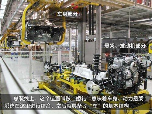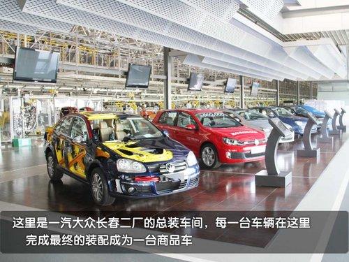 這里是一汽大眾長春第二工廠的總裝車間,車輛門在這里完成“最后的儀式”。在總撞車間的門口可以看到這里生產(chǎn)的每一款車型,打頭的一臺速騰解剖車非常吸引大家的注意(我們隨后會有單獨文章詳細(xì)介紹)。從前一工序的噴漆線來到總裝線的準(zhǔn)新車都在天上“飛著”。而等到車輛從天上降落到地上之后車輛距離生產(chǎn)完畢就很快了。
