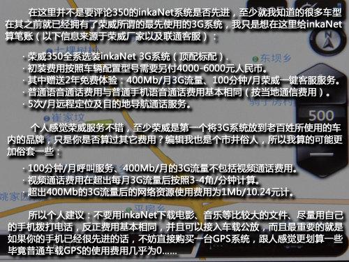 不同于那些高端品牌的汽車的3G系統(tǒng),350提供了更多的3G服務(wù),比如語音/視頻通話、影音服務(wù)、GPS定位等等各種服務(wù),當(dāng)然可能因?yàn)楣P者僅僅是個(gè)市井小生,所以對(duì)于350的3G系統(tǒng)的費(fèi)用,我一直持保留意見,畢竟贈(zèng)送100分鐘的通話時(shí)長聽上去不錯(cuò),但它僅僅支持與榮威客服的通話,這點(diǎn)讓我感覺這免費(fèi)通話時(shí)長跟沒有沒太大區(qū)別。