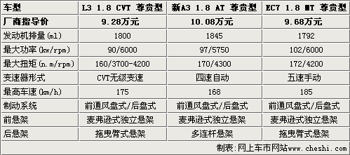 帝豪EC7的最大功率高于其他兩款車型,并且配備了五速手動(dòng)變速箱,能擁有185km/h的最高車速是比較正常的。相對而言,奇瑞A3的動(dòng)力優(yōu)勢并不明顯,再配備四速自動(dòng)變速箱,動(dòng)力和經(jīng)濟(jì)性也明顯不如其他兩款車型。比亞迪L3的發(fā)動(dòng)機(jī)雖然功率比較小,但CVT無級(jí)變速箱給這款車加分不少,而且通風(fēng)盤式制動(dòng)也不遜于其他產(chǎn)品。