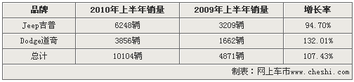 Jeep吉普和Dodge道奇兩大品牌在2010年上半年銷量已經(jīng)超過2009年全年的總銷量。2010年上半年Jeep吉普品牌車型銷量達(dá)6248量,較去年上半年增長(zhǎng)了94.7%。