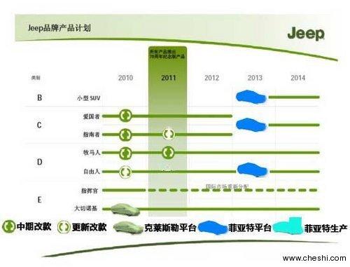 通過Jeep近兩年的產(chǎn)品規(guī)劃圖可以看出,Jeep自由人將于2013年開始使用菲亞特生產(chǎn)平臺(tái)前,而且在明年還將推出新款自由人。Jeep牧馬人將于明年推出70周年紀(jì)念版車型,并且一直持續(xù)生產(chǎn)。除Jeep指揮官將于2010年末停產(chǎn)外,Jeep大切諾基將繼續(xù)保持克萊斯勒血統(tǒng)一直生產(chǎn),并且新款大切諾基將于今年年底引入國(guó)內(nèi)。