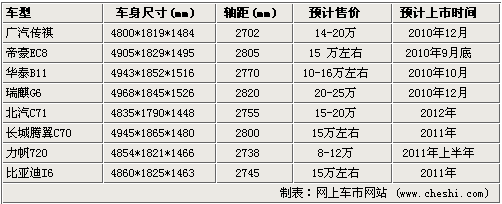 從上表可以看到,這八款新車型瑞麒G6的尺寸最大,車長2968mm、軸距達(dá)2820mm,其次是長城騰翼C70,而最先推向市場的很可能是帝豪EC8,預(yù)計(jì)售價(jià)15萬左右,搭載2.0L和2.4L發(fā)動(dòng)機(jī)。剛剛下線的傳祺將于廣州車展上市,預(yù)計(jì)售價(jià)14-20萬元之間。
