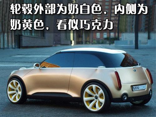 MINI Core概念車采用內(nèi)凹陷七幅白色輪轂,內(nèi)側(cè)噴涂的是奶黃色,造型非?蓯劬腿缬汕煽肆χ瞥梢粯。