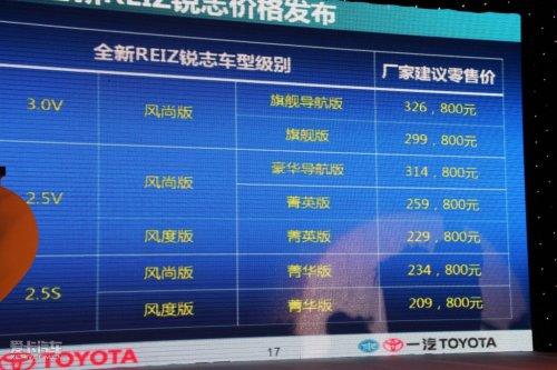 此次國產(chǎn)新一代豐田銳志推出了2.5L、3.0L兩種排量共計7款車型。其中2.5L排量的車型包括:2.5S風度菁華版、2.5S風尚菁華版、2.5V風度菁英版、2.5V風尚菁英版、2.5V風尚豪華導航版;3.0L排量的包括:3.0V風尚旗艦版、3.0V風尚旗艦導航版。
