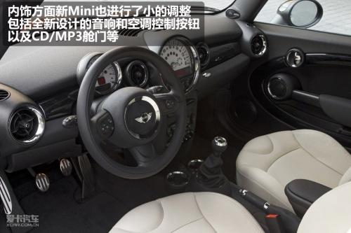 內(nèi)飾方面新MINI也進(jìn)行了小的調(diào)整,其中包括全新設(shè)計的音響和空調(diào)系統(tǒng)控制按鈕、以及CD/MP3艙門等。配置方面將增加升級版收音機、MP3/CD播放器、AUX接口微型導(dǎo)航儀、彩色行車電腦顯示器、藍(lán)牙和USB音頻接口等。