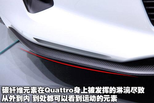 碳纖維元素在奧迪Quattro概念車身上隨處可見,車頭部位只是低調(diào)的在小包圍上用到了這一元素,等一會(huì)到車尾和內(nèi)部,大家就會(huì)認(rèn)可隨處可見這個(gè)詞,因?yàn),奧迪Quattro概念車身上真的配備了很多碳纖維面板。