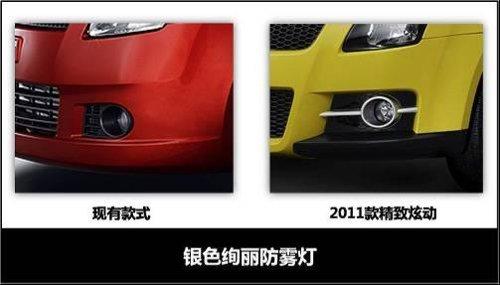 2011款雨燕在外型上與現(xiàn)款車型相比有了很大突破,甚至能夠稱之為運(yùn)動款,運(yùn)動元素遍布整個(gè)車身。前大燈、霧燈裝飾、前保險(xiǎn)杠、進(jìn)氣格柵均進(jìn)行了重新設(shè)計(jì)。前臉上巨大的進(jìn)氣口和黑底的前大燈顯得酷勁十足且更具侵略性;霧燈區(qū)域的變化也很搶眼,原本與條紋格柵相一致的黑色霧燈經(jīng)過銀色裝飾后,視覺沖擊力更強(qiáng)。車身側(cè)面增加了空氣動力學(xué)側(cè)圍裙邊,動感魅力更加明顯。